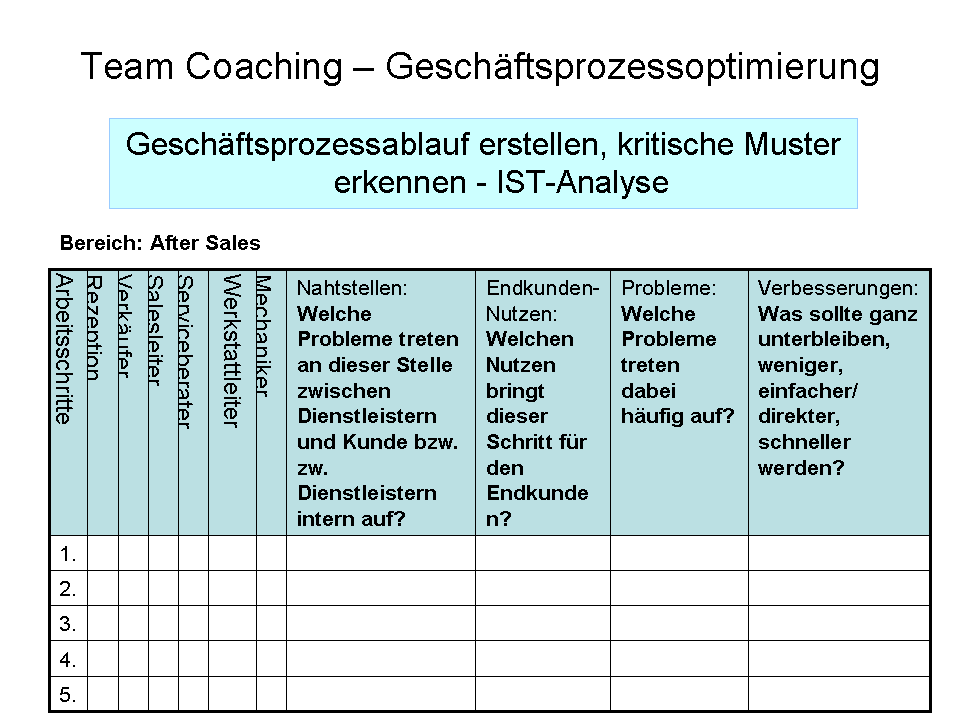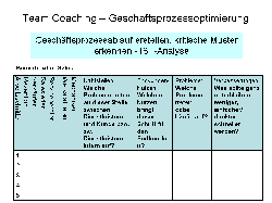 Mit einer Geschäftsprozessanalyse und –optimierung unter Teilnahme der wesentlichen im Prozess Beteiligten können Sie Ihre Arbeitsprozesse überprüfen und so optimieren, dass die Arbeitszufriedenheit und das Endergebnis übereinstimmen werden. Die verbesserten Arbeitsprozesse und neu gestaltete Nahtstellen werden zur Steigerung des Kundennutzens und Erreichung der Unternehmensziele schnell beitragen.